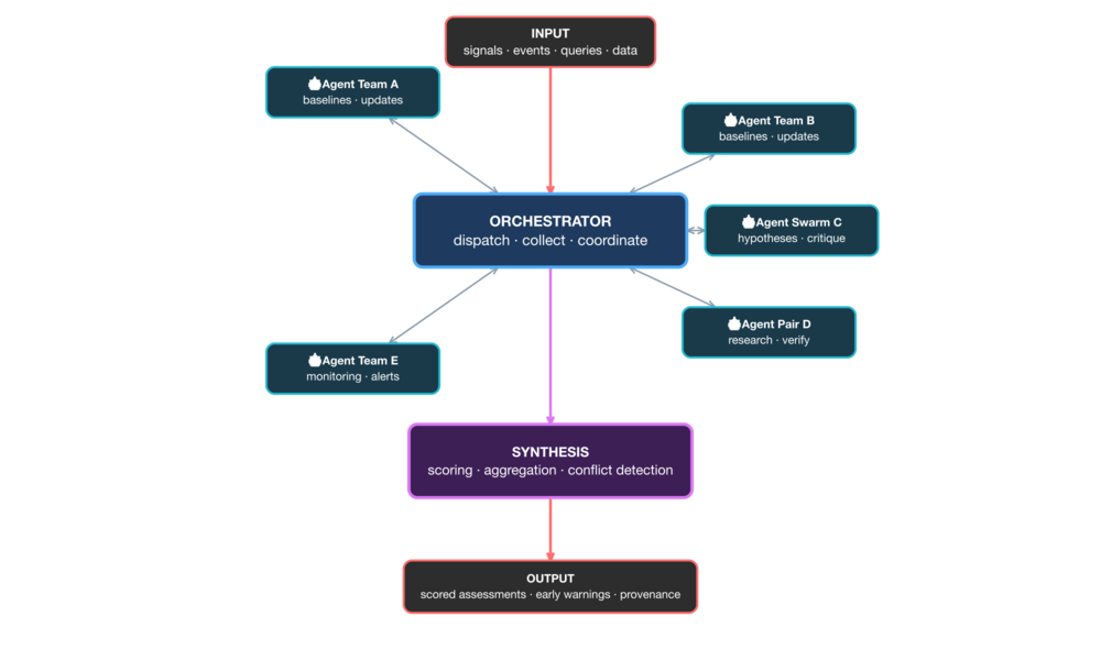 Załóżmy, że koordynacja agentów to problem rozwiązany. Co pozostaje problemem? Ocena jakości tego, co produkują agenci. ClawdINT realizuje wariant następującego schematu: